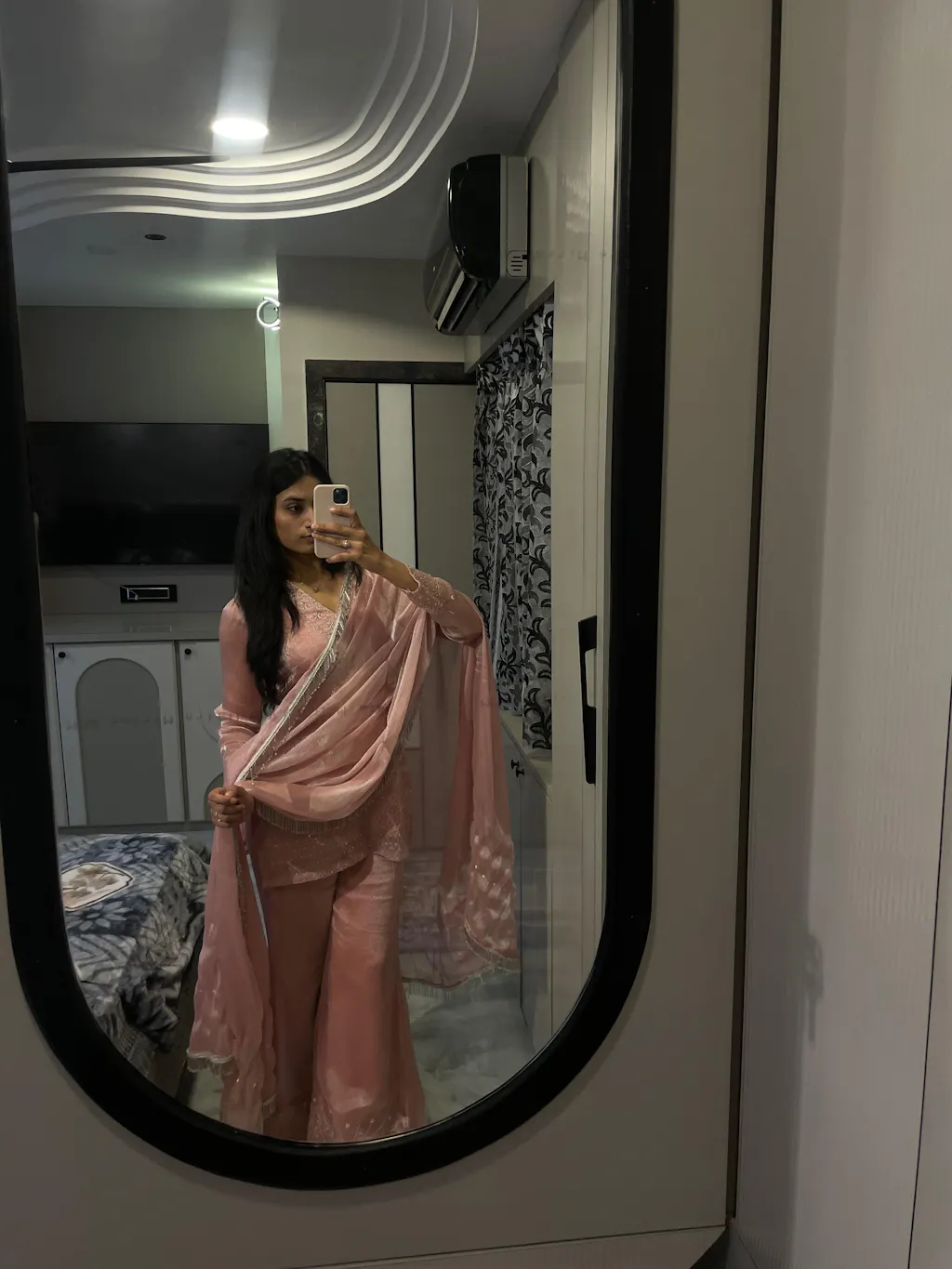 This enchanting Inayat Suit, crafted from the finest Jimmy Choo satin fabric in a delicate pink shade features a short, straight kurta adorned with white pearls and intricate silver kasab embroidery Paired with a striking bell-bottom palazzo, intricately embroidered at the hem, and is completed with a matching dupatta, adorned with a hanging silver and white border on all four sides and heavy hand embroidery on two sides, elevating the overall aesthetic to one of regal sophistication.